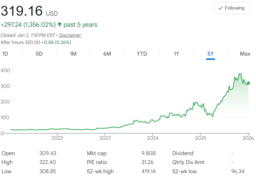 Five years ago, Sterling Infrastructure $STRL ( ▼ 4.68% ) shares were trading around $21.20 each. Today, it's closed at $319.16—a remarkable 1,356% rise that comes from its strong work in heavy civil, residential, and specialty services, riding the wave of U.S. infrastructure spending and construction demand. The chart shows steady progress from 2022 lows, with real acceleration in 2024-2025, and after-hours at $320.00. That 52-week high of $419.14 stands as the recent top mark.