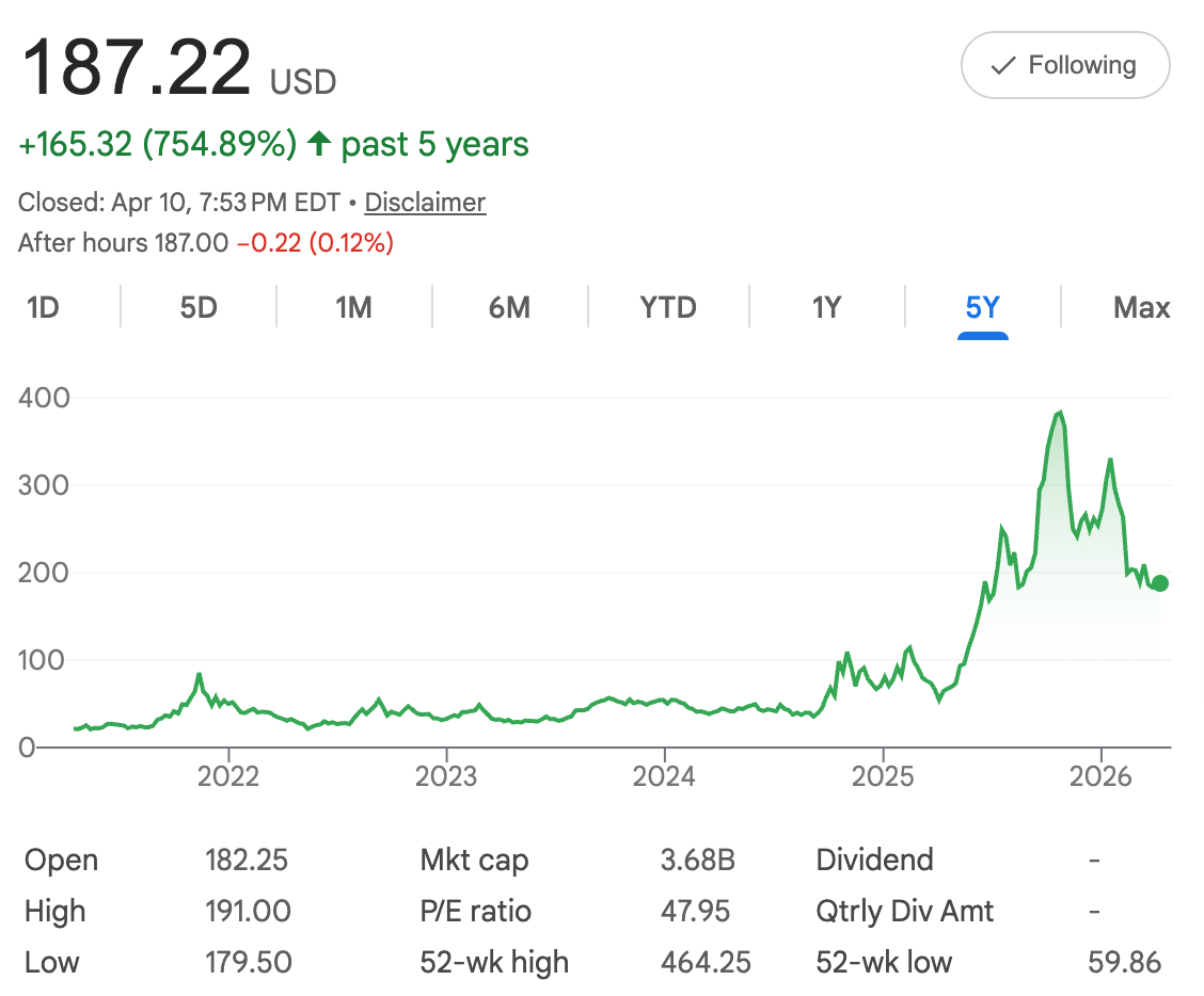 Picture this: Five years ago, Centrus Energy $LEU ( ▲ 2.55% ) stock traded around $22 per share. Today, it closes at $187.22 — a powerful +755% gain. The chart shows a long base followed by sharp upward moves in recent years, fueled by rising demand for uranium and nuclear energy.