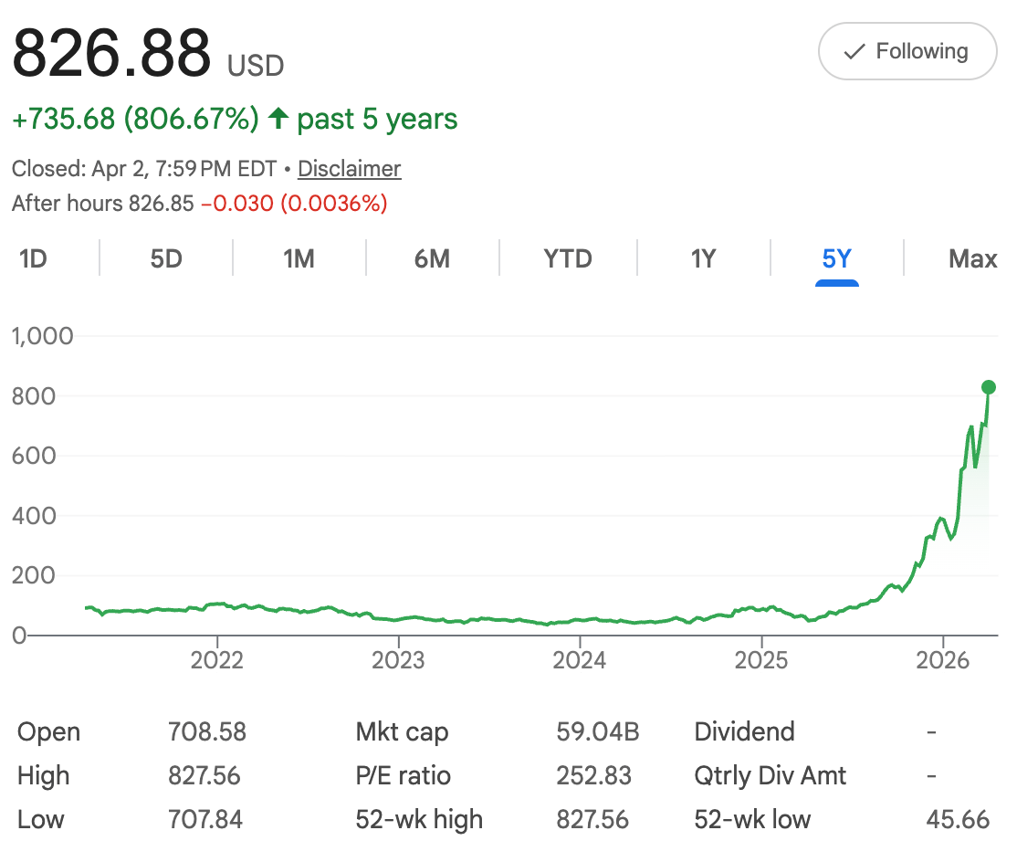 Picture this: Five years ago, Lumentum Holdings $LITE ( ▲ 10.03% ) stock traded around $91 per share. Today, it closes at $826.88 — an impressive +807% gain. The chart shows a long flat period followed by explosive upward movement in recent years, driven by strong demand for optical components in data centers, AI infrastructure, and high-speed networking.