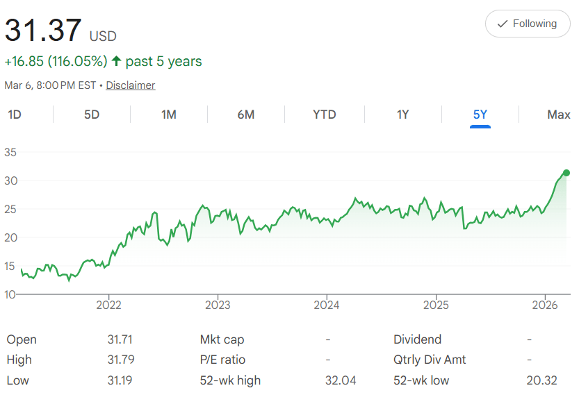 The 52-week high reached $32.04, sitting just above the current price and highlighting recent strength in the sector.