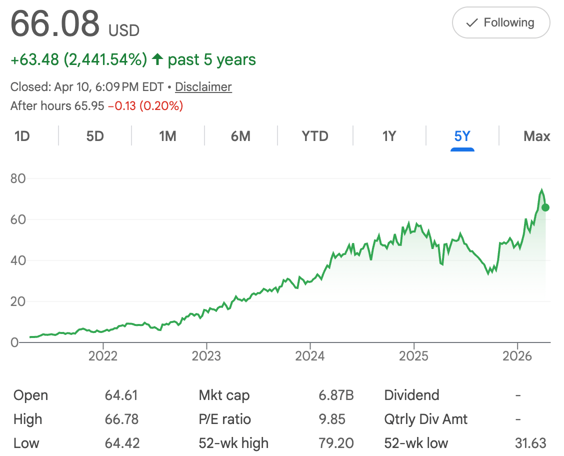 Picture this: Five years ago, Vista Energy $VIST ( ▼ 2.82% ) stock traded around $2.60 per share. Today in April 2026, it closes at $66.08 — an extraordinary +2,442% gain. The chart shows a long base followed by sharp, consistent upward movement, especially in recent years, driven by strong oil production and energy demand.