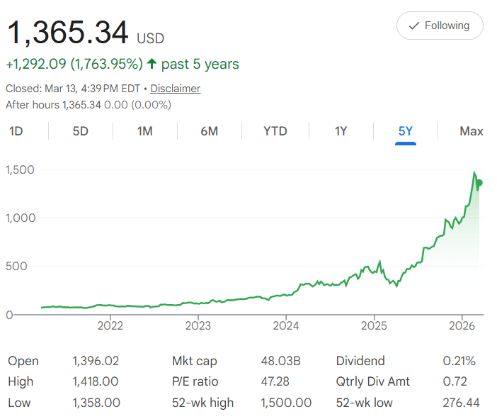 The 52-week high hit $1,500.00, sitting close by and showing the stock has pushed to even loftier levels recently.